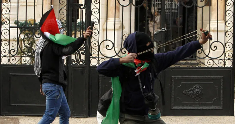 شبان ملثمون في بيت لحم يستخدمون «النقيفة» (النبلة) في رشق جنود الاحتلال بالحجارة (أ.ف.ب)