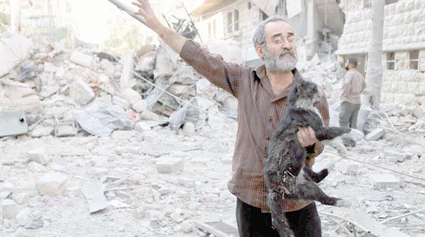 سوري يحمل قطة بعد أن أنقذها من بين ركام مبنى دُمِّر جراء قصف حكومي ببرميل متفجر استهدف حي بستان القصر في حلب أمس (رويترز)