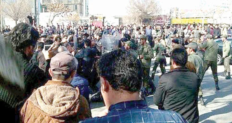 صورة من مواقع التواصل الاجتماعي لمحتجين وهم يواجهون قوات الأمن في كرمانشاه صباح أمس