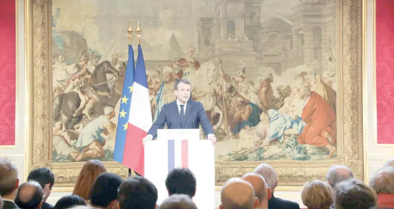ماكرون خلال مؤتمر صحافي في باريس أمس (أ.ف.ب)