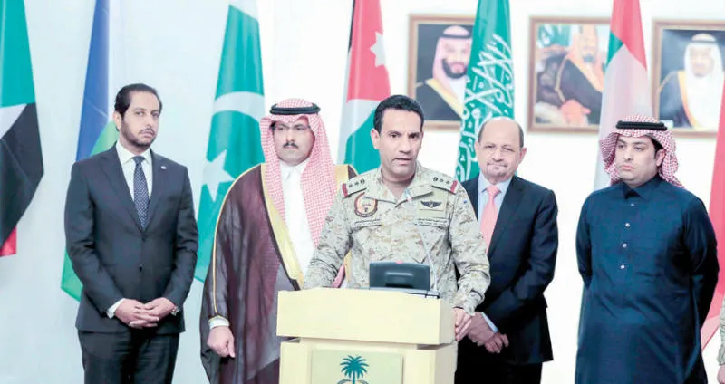 العقيد تركي المالكي المتحدث باسم التحالف وخلفه السفير السعودي لدى اليمن والسفير اليمني في الرياض عقب اجتماع سفراء التحالف أمس (تصوير: بشير صالح)