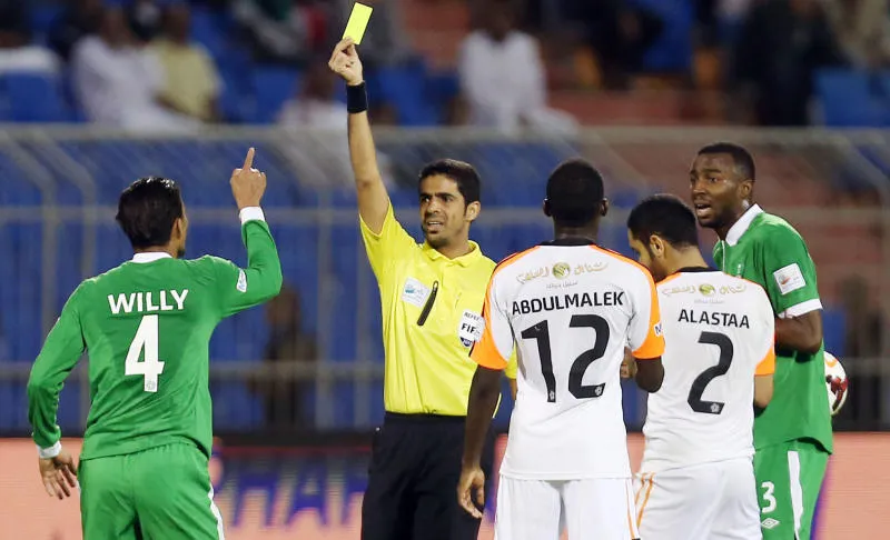حكم المباراة الهذلول أشهر 7 بطاقات صفراء بسبب الأداء الخشن من لاعبي الفريقين (تصوير: عبد العزيز النومان)