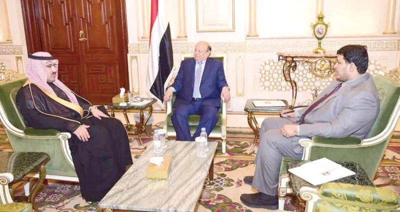الرئيس اليمني عبد ربه منصور هادي خلال استقباله السفير السعودي لدى اليمن محمد آل جابر في الرياض (أمس)
