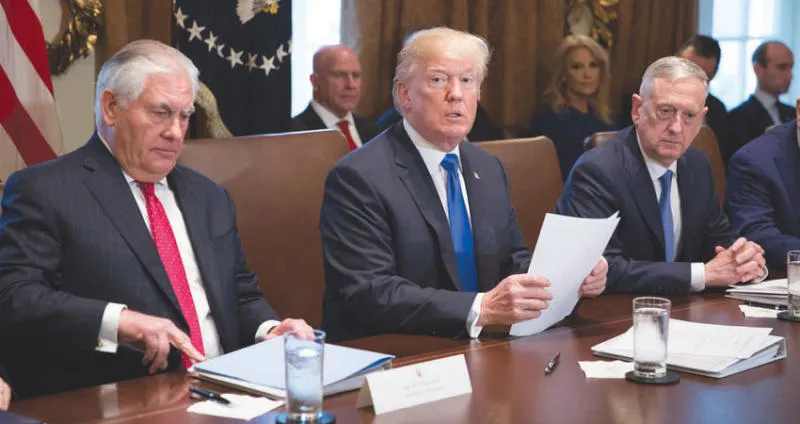 الرئيس ترمب يتوسط وزير خارجيته تيلرسون ووزير الدفاع ماتيس (إ.ب.أ)