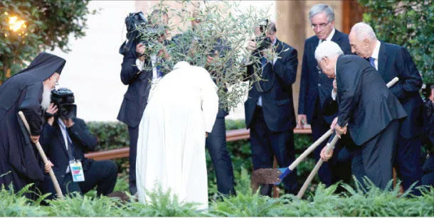 من اليسار: البطريرك المسكوني بارثولوميو والبابا فرنسيس والرئيس الفلسطيني محمود عباس والرئيس الإسرائيلي شيمعون بيريس يشتركون في غرس شجرة زيتون في حديقة الفاتيكان أمس (إ.ب.أ)