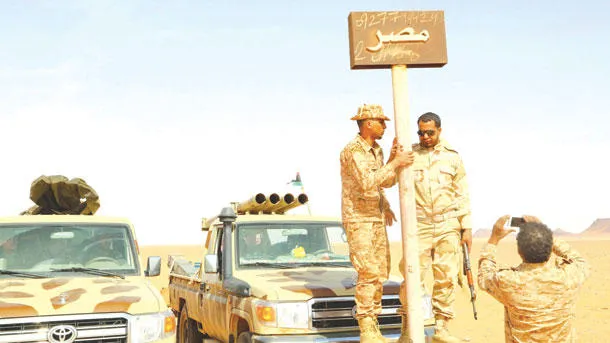 عناصر من الجيش الوطني الليبي في منطقة الكفرة لدى مشاركتهم في «عملية الكرامة» أمس (رويترز)