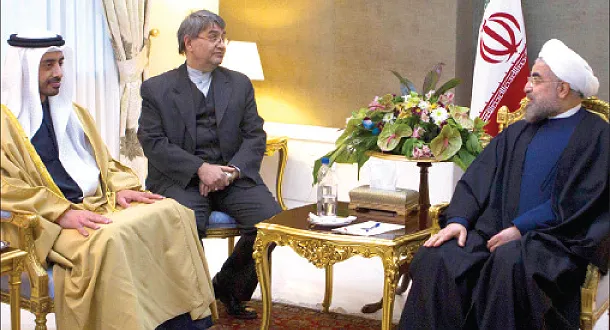 الرئيس الإيراني حسن روحاني لدى استقباله الشيخ عبد الله بن زايد في طهران أمس (أ.ب)