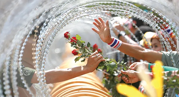 متظاهر يقدم وردا إلى جندي خلال مسيرة مناهضة للحكومة قرب وزارة الدفاع في بانكوك أمس (أ.ب)