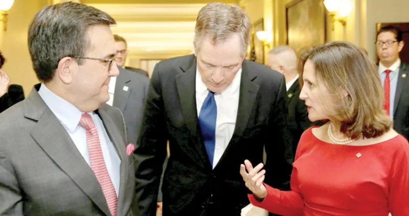 المفاوض التجاري الأمريكي يتوسط وزيرة الخارجية الكندية ووزير خارجية المكسيك (رويترز)