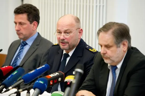 من اليسار: المحقق الخاص لشرطة دريسدن مايك ميندا وقائد شرطة المنطقة، ديتر كرول والمدعي العام إريك وينزليك، في مؤتمر صحافي في دريسدن، شرق ألمانيا