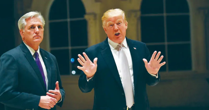 ترمب يخاطب الصحافيين برفقة النائب الجمهوري كيفين ماكارثي مساء الأحد (أ.ف.ب)