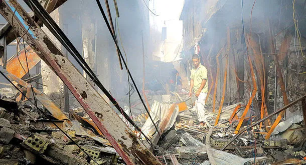 جانب من الدمار الذي خلفه قصف بالمروحيات في سوق بالرمادي أول من أمس (رويترز)
