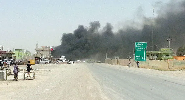 الدخان يتصاعد من نقطة تفتيش للشرطة العراقية بعد تفجيرين في طوزخورماتو إلى الشمال من بغداد أمس (أ.ف.ب)