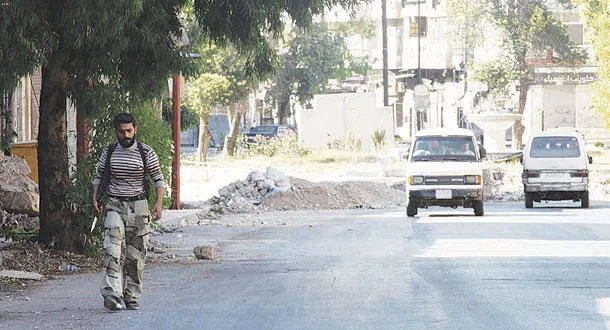 مقاتل في الجيش السوري الحر يسير في أحد شوارع مدينة حلب أمس (رويترز)