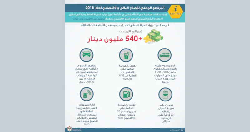 ووافقت الحكومة على النظام المعدل لنظام رسوم رخص القيادة وتسجيل وترخيص المركبات لسنة 2018، والذي تضمن تخفيض رسوم نقل ملكية المركبات حسب مختلف المركبات. ويهدف التعديل إلى تخفيض الرسوم الإضافيّة لنقل ملكيّة المركبات، انسجاماً مع التزام الحكومة بإجراء مراجعة دورية لكل القرارات الرسمية الاقتصادية للتثبت من جدواها وتحقيقها للأهداف الموضوعة من أجلها.