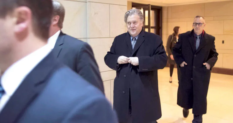 بانون يغادر مبنى الكونغرس بعد الإدلاء بإفادته أول من أمس (إ.ب.أ)