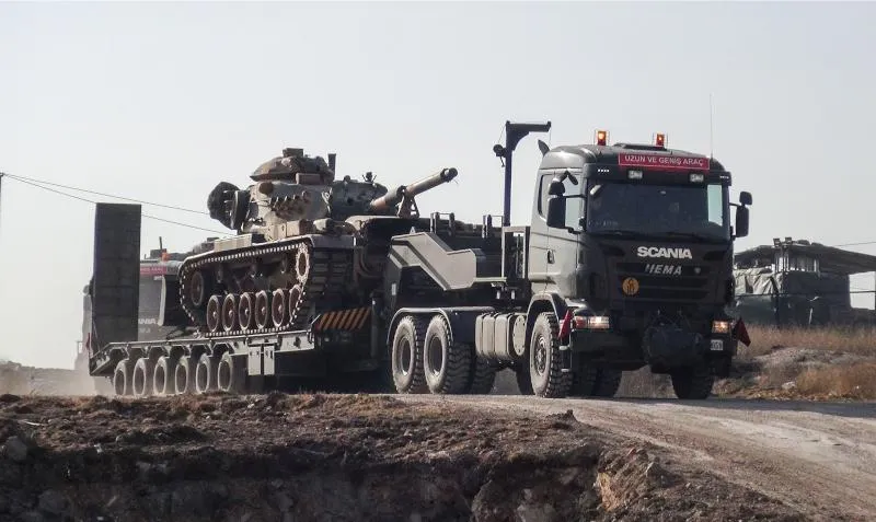 شاحنة تنقل دبابة تركية قرب الحدود السورية (أ.ف.ب)