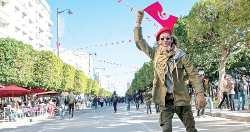 تونسي يلوح بعلم بلاده خلال مسيرة بذكرى 7 سنوات على الثورة التونسية (أ.ب)