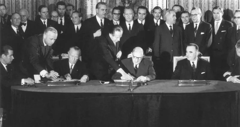 توقيع ميثاق الإليزيه بعد الحرب العالمية الثانية بين الرئيس الفرنسي شارل ديغول والمستشار الألماني الأول كونراد أديناور سنة 1963 (غيتي)