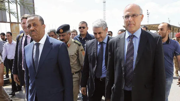 رئيس الوزراء الليبي عبد الله الثني والسفير البريطاني مايكل آرون ورئيس أركان القوات المسلحة الليبية اللواء عبد السلام جاد الله (خلف) خلال وداعهم لدفعة من ضباط وضباط صف وأفراد من الجيش الليبي المتجهين الى بريطانيا للمشاركة في دورة تدريبية، في مطار معيتيقة الدولي أمس (أ.ف.ب)