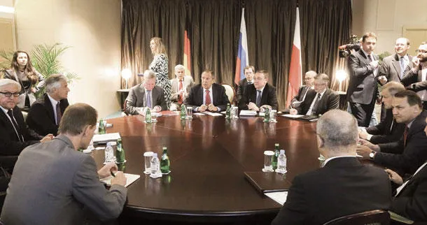 وزير الخارجية البولندي رادوسلاف سيكورسكي (يمين) ونظيراه الروسي سيرغي لافروف (وسط) والألماني فرانك - فالتر شتاينماير (يسار) أثناء اجتماعهم لمناقشة الأزمة الأوكرانية في سان بطرسبورغ أمس (إ.ب.أ)