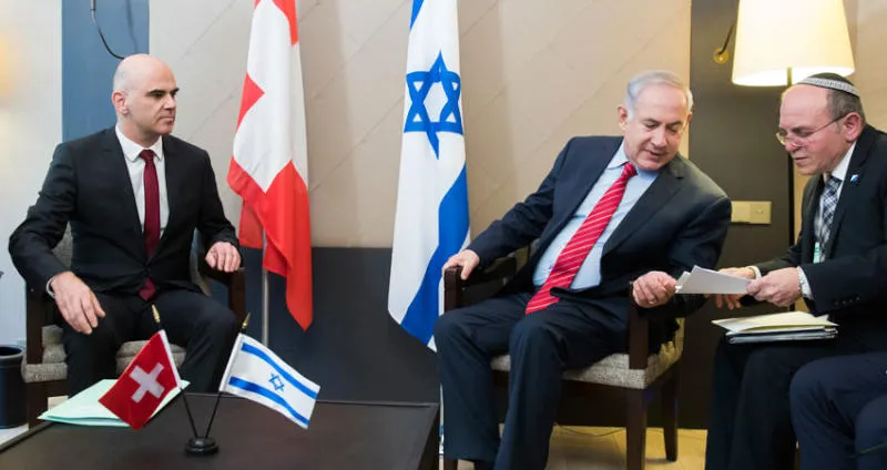 الرئيس السويسري آلان بيرسيت (يسار) وبنيامين نتنياهو (الثاني من اليمين) خلال لقاء في دافوس أمس (أ.ب)