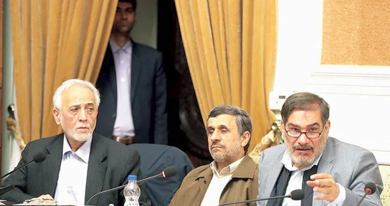 الرئيس الأسبق محمود أحمدي نجاد إلى جانب أمين عام مجلس الأمن القومي علي شمخاني أثناء آخر اجتماع لمجلس تشخيص مصلحة النظام الأحد الماضي (تسنيم)