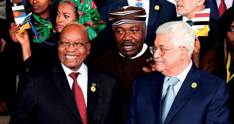 رئيس جنوب أفريقيا والرئيس الغابوني والرئيس الفلسطيني في أديس أبابا أمس (أ.ف.ب)