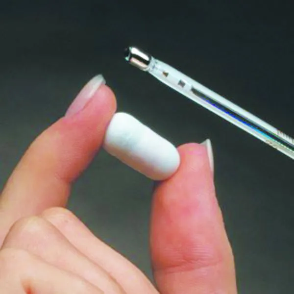 وثمة قرص من هذا النوع يدعى «كور تيمب إنجيستبيل كور بودي تيمبريشر سينسور» CorTemp Ingestible Core Body Temperature Sensor من صنع شركة «إتش كيو» في بالميتو ولاية فلوريدا مجهز ببطارية مشيدة داخله يقوم ببث حرارة الجسم في الزمن الحقيقي لاسلكيا لدى تنقله عبره.