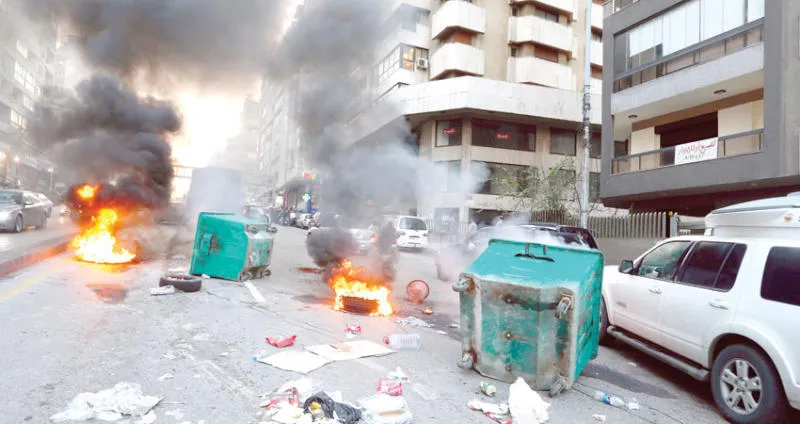 سيارات تجتاز الإطارات المحترقة في بيروت أول من أمس (رويترز)