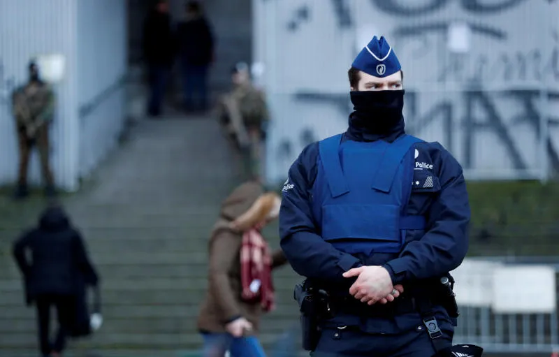 أحد رجال الشرطة البلجيكية خارج قاعة المحكمة (رويترز)