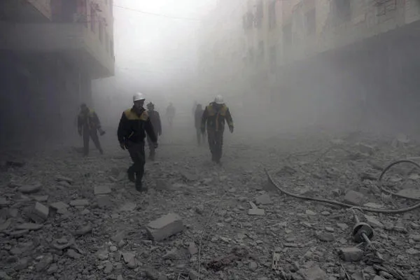 البحث عن ناجين بعد القصف الذي استهدف منطقة تسيطر عليها المعارضة قرب دمشق (آ.ب)