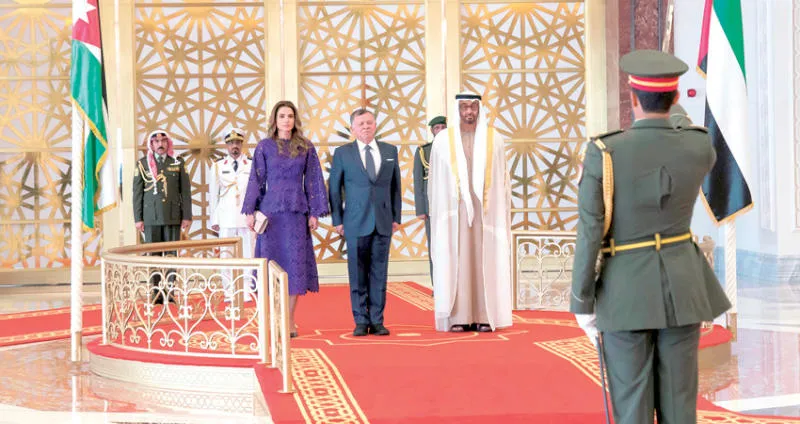الشيخ محمد بن زايد والملك عبدالله الثاني وقرينته الملكة رانيا خلال مراسم الاستقبال في أبوظبي أمس (وام)