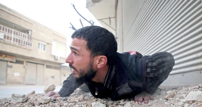 شاب من بلدة عربين في الغوطة الشرقية يحاول تحاشي غارة من طيران النظام أمس (أ.ب)
