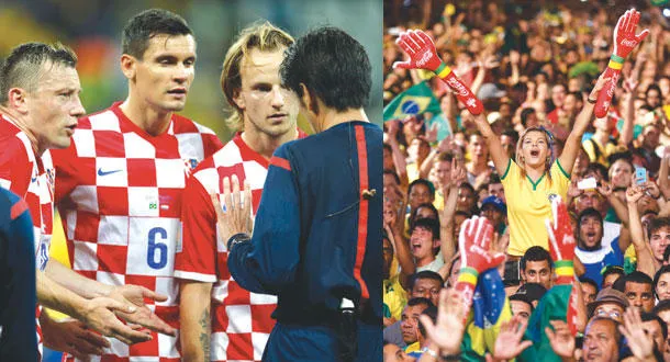 أطلقت المباراة الافتتاحية لمونديال البرازيل 2014 أول جدل حول التحكيم؛ فبمنحه ضربة جزاء مشكوكا بصحتها للمنتخب المضيف، أعاد الحكم الياباني يويشي نيشيمورا فتح النقاش في شأن الاستعانة بأشرطة الفيديو في التحكيم. وكان الحكم الياباني منح البرازيل ضربة جزاء إثر ملامسة ناعمة من المدافع الكرواتي ديان لوفرين على فريد داخل المنطقة، ليمنح نيمار التقدم لمنتخب بلاده بعدما انبرى لها بنجاح في الدقيقة 71، وعاد منتخب السامبا ليسجل هدفا ثالثا من خلال أوسكار في الدقيقة 90 ليفوز 3-1.