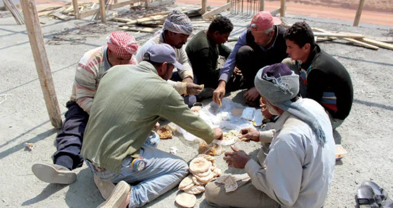 بعض العاملين في بناء تجمعات سكنية جديدة شرق القاهرة يحصلون على قسط من الراحة («الشرق الأوسط»)