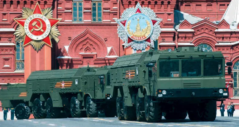 صورة أرشيفية لـ«صواريخ إسكندر» التي عرضت في الساحة الحمراء بمناسبة ذكرى هزيمة النازيينوقال رئيس ليتوانيا إن موسكو نصبت بشكل دائم صواريخ بقدرات نووية في منطقة كلينينغراد في بحر االبلطيق (أ.ب)