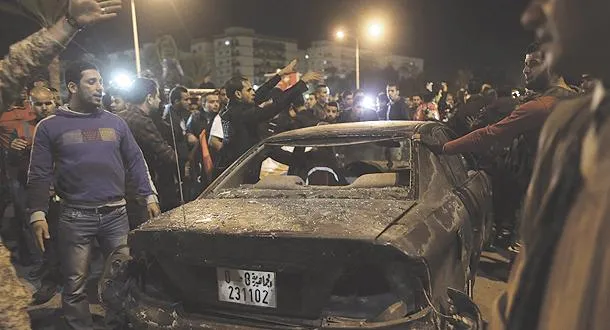 ليبيون يعاينون موقع تفجير استهدف مسيرة تأييد للجيش والشرطة وتنديد بمجموعة «أنصار الشريعة» في بنغازي يوم الجمعة الماضي (رويترز)