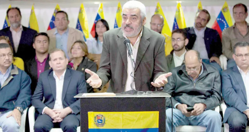 زعيم المعارضة أنخيل أروبيسا في مؤتمر صحافي معلناً مقاطعة الانتخابات المقبلة (أ.ب)