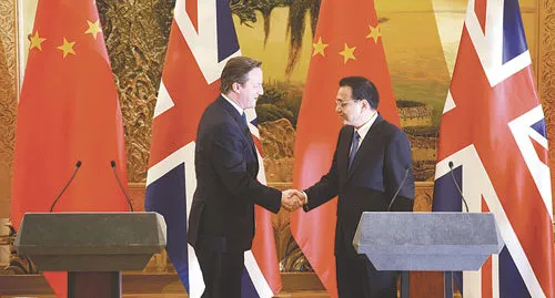 التقى رئيس الوزراء البريطاني ديفيد كاميرون، رئيس الوزراء الصيني لي كه تيانغ أمس وقال إنه يرغب في إزالة العوائق التجارية مع الصين، مقدما بريطانيا باعتبارها «شريكا مثاليا» للصين الصاعدة. وبعد اجتماع ثنائي حضر لي وكاميرون حفل توقيع عشر اتفاقيات في «قاعة الشعب الكبرى».