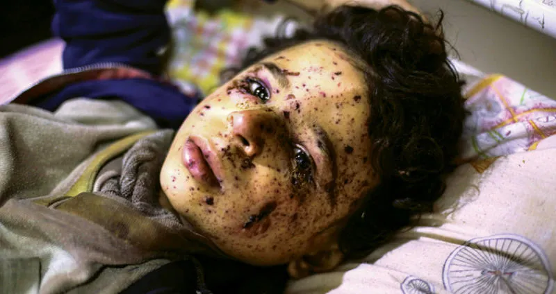 صبي أصيب في غارة جوية أمس يرقد في مستشفى ميداني بالعتيبة في غوطة دمشق (أ.ف.ب)