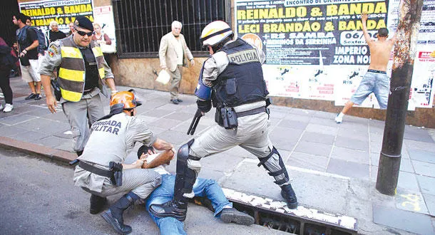 رجال مكافحة الشغب يلقون القبض على أحد المحتجين البرازيليين بالقرب من ملعب ماركانا (رويترز)