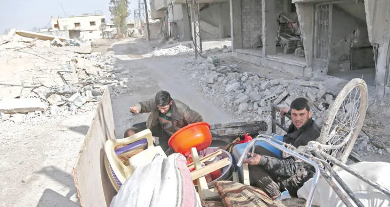 نازحون ينتقلون في غوطة دمشق أمس (أ.ف.ب)