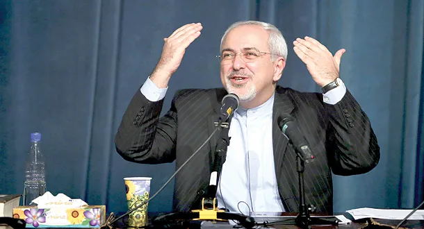 وزير الخارجية الإيراني محمد جواد ظريف خلال لقائه أمس بطلبة في جامعة طهران (أ.ب)
