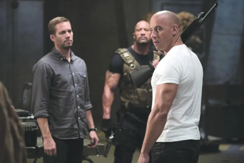 بول ووكر (إلى اليسار) مع شريكيه في البطولة فن ديزل ودواين جونسون