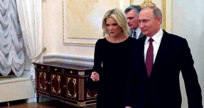 بوتين والصحافية ميغان كيلي قبل إجرائه مقابلة لقناة «إن بي سي» بموسكو مطلع مارس الحالي (رويترز)