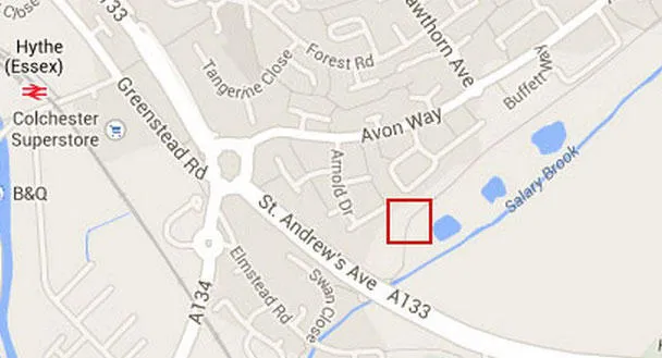 صورة للمنطقة التي وقعت بها الحادثة، والمربع الأحمر يشير إلى مسرح الجريمة "موقع شرطة أسيكس"