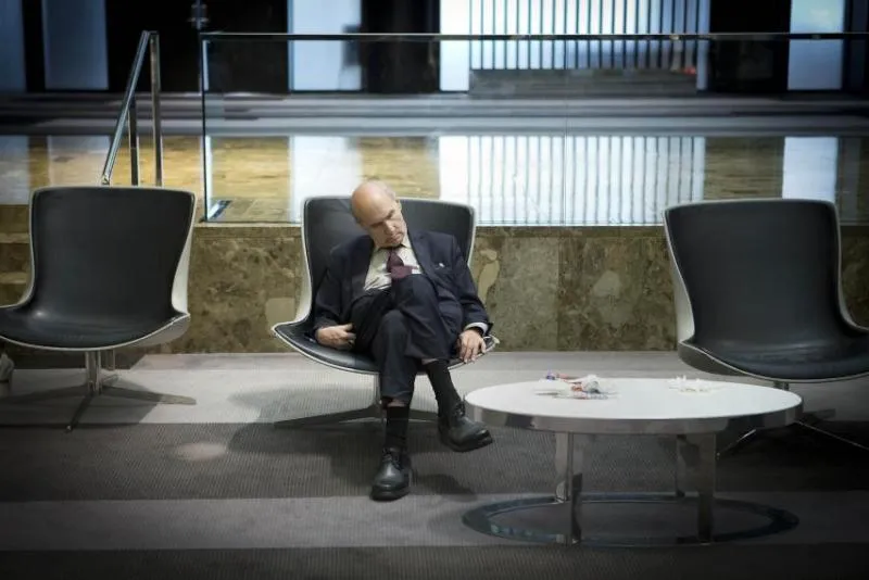 رجل يأخذ قيلولة أثناء انتظاره لبدء اجتماع عمل في منتصف النهار (رويترز)