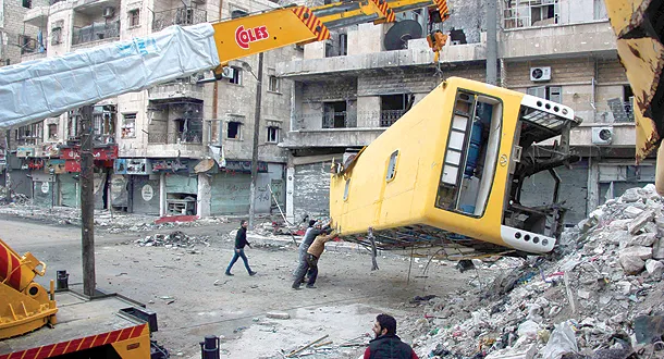 مقاتلون سوريون يحاولون رفع حافلة مدمرة لبناء حواجز قتالية في حي صلاح الدين بمدينة حلب أمس (أ.ف.ب)