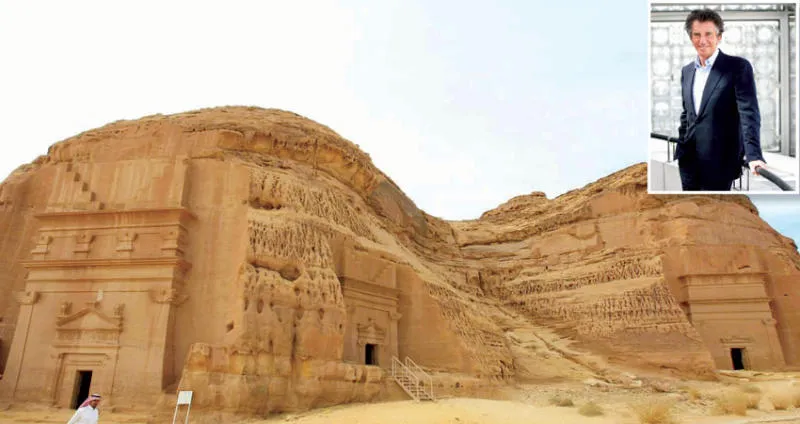 مدائن صالح الأثرية... وفي الإطار جاك لانغ رئيس معهد العالم العربي في باريس («الشرق الأوسط»)